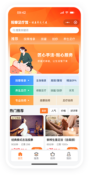 足疗店、按摩店等,顾客提前线上预约熟悉技师,查看技师、排班选择服务时间段,提高服务满意度