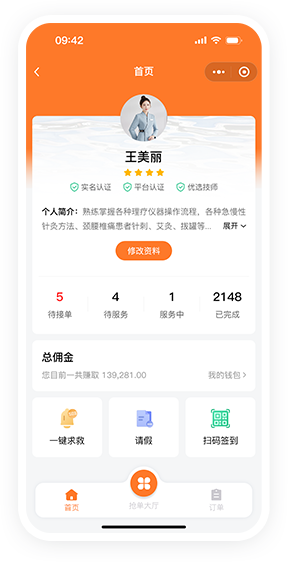 查看自身服务数据,例如总订单数、已完成订单数、累计佣金等,向平台申请提现佣金