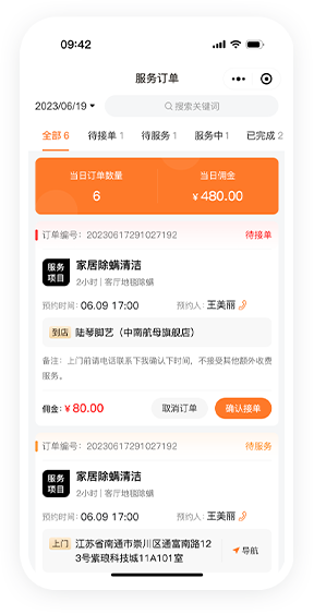 管理个人服务预约订单,确认接取用户或平台指定服务人员订单,按天筛选各状态订单